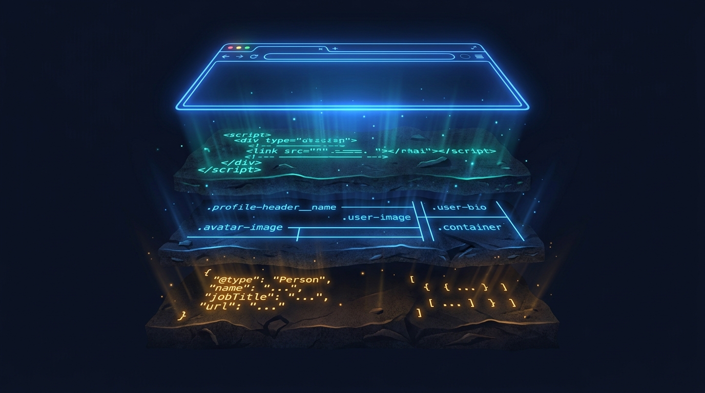}The stability hierarchy: Schema.org for fields that matter most, inline JSON for configuration and auth tokens, CSS selectors for everything else, data-* attributes as a bonus layer for IDs and state.